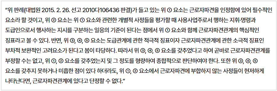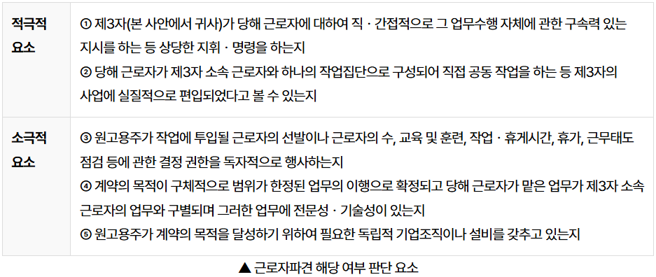 즉, 최근 법원은 근로자파견 판단에 있어 사용사업주의 상당한 지휘·명령권 행사 여부를 핵심 요소로 보아, 적극적 요소(①, ②)를 중심으로 판단하되, 소극적 요소(③, ④, ⑤)를 보완적으로 고려하고 있는 것으로 보입니다.