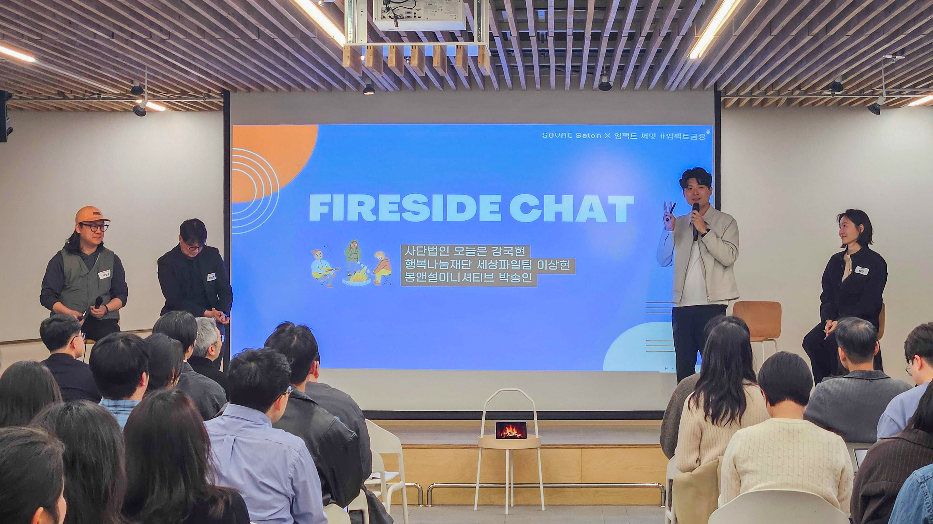 행사는 오픈렉처와 발제 세션, 파이어사이드 챗으로 이어졌습니다. 한양대학교 파이낸스 경영학과 강창모 교수의 개념 정리로 시작해 루트임팩트 허재형 대표, 아름다운재단 김진아 사무총장, 임팩트스퀘어 도현명 대표가 발제했고, 사단법인 오늘은 강국현 사무국장, 행복나눔재단 이상현 본부장, 봉앤설이니셔티브 박송인 사무국장이 박정웅 팀장의 진행으로 현장 이야기를 나눴습니다.